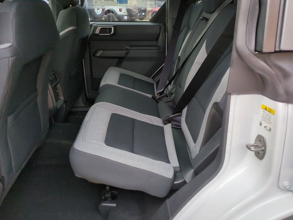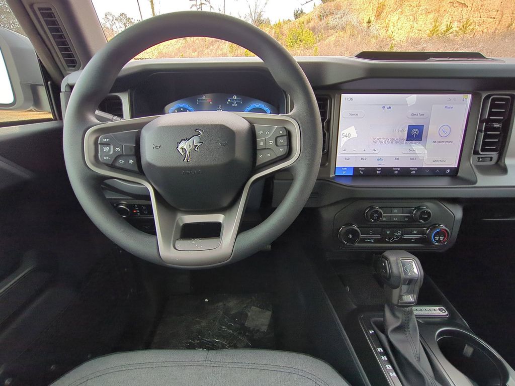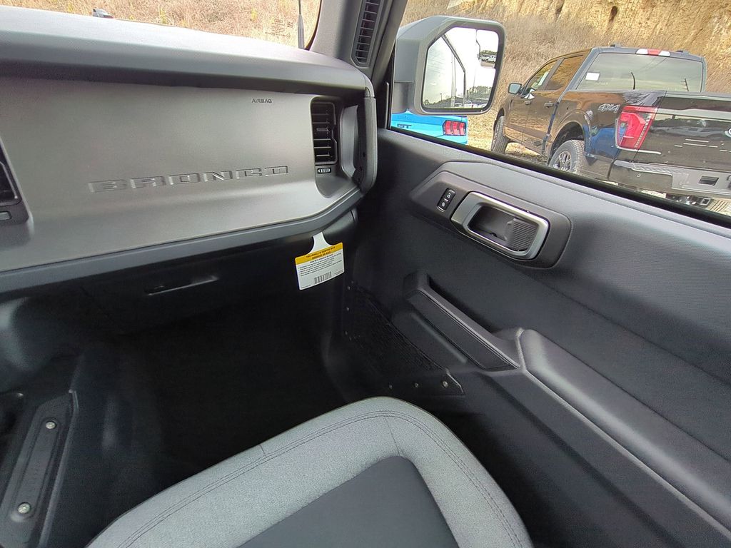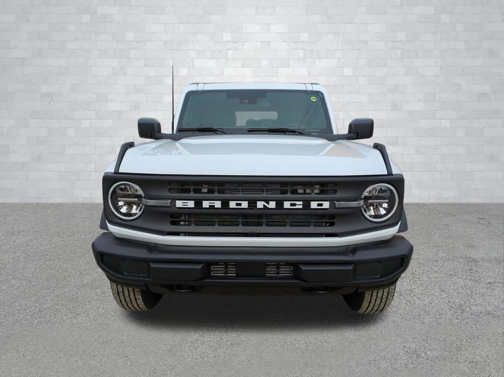 2025 Oxford White 2025 Ford Bronco Base 4WD 2.3L EcoBoost I-4 4-Wheel Disc Brakes, 4.46 Axle Ratio, 7 Speakers, ABS brakes, Air Conditioning, AM/FM radio: SiriusXM with 360L, AM/FM Stereo, Auto High-beam Headlights, Brake assist, Cloth Bucket Seats, Compass, Delay-off headlights, Driver door bin, Driver vanity mirror, Dual front impact airbags, Dual front side impact airbags, Electronic Stability Control, Emergency communication system: 911 Assist, Exterior Parking Camera Rear, Front anti-roll bar, Front Bucket Seats, Front Center Armrest, Front reading lights, Front wheel independent suspension, Fully automatic headlights, Heated door mirrors, Illuminated entry, Integrated roll-over protection, Internet access capable: FordPass Connect, Low tire pressure warning, Occupant sensing airbag, Outside temperature display, Overhead airbag, Overhead console, Panic alarm, Passenger door bin, Passenger vanity mirror, Power door mirrors, Power steering, Power windows, Radio data system, Remote keyless entry, Security system, SiriusXM w/360L, Speed control, Split folding rear seat, Steering wheel mounted audio controls, SYNC 4, Tachometer, Telescoping steering wheel, Tilt steering wheel, Traction control, Trip computer, Variably intermittent wipers, and Wheels: 16" Bright Polished Silver-Painted Steel Courtesy Ford and Lincoln of Rome 101 Hwy 411 E Rome, Ga 30161 ROMEFORDLINC.COM 706.235.4453.
