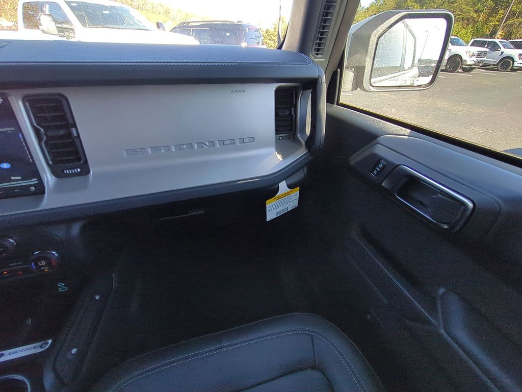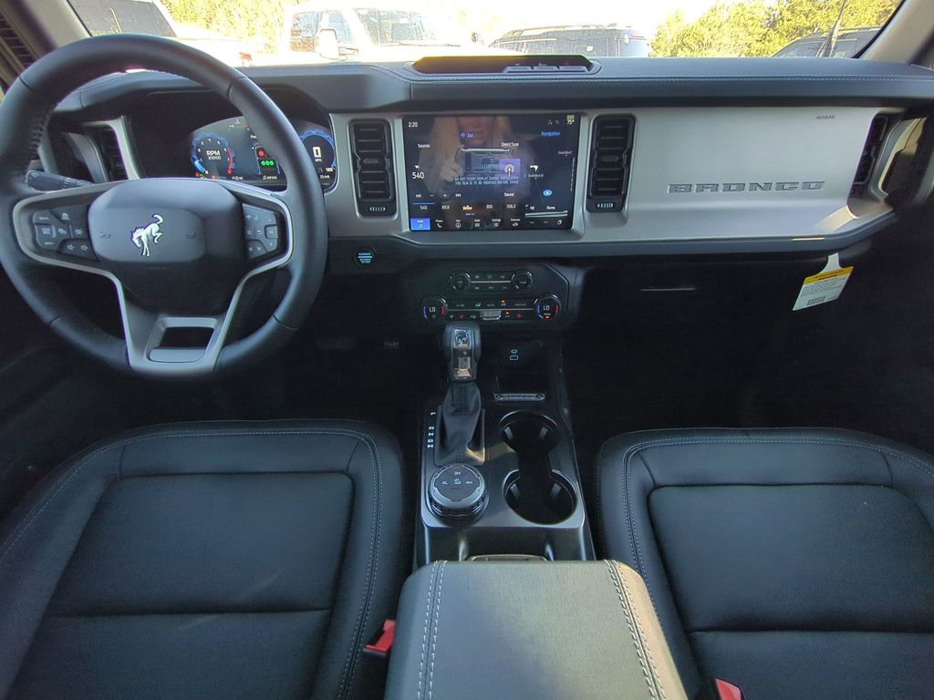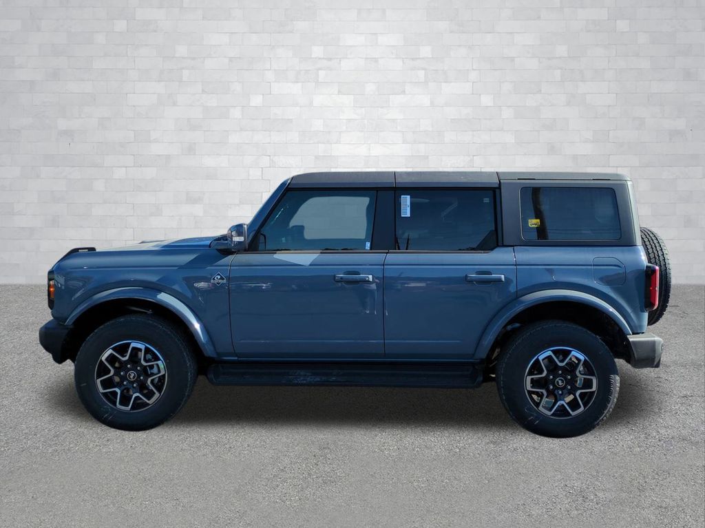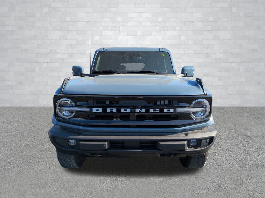 2025 Azure Gray Metallic Tri-Coat 2025 Ford Bronco Outer Banks 4WD 2.3L EcoBoost I-4 Equipment Group 314A Lux Package (360-Degree Camera, Adaptive Cruise Control, Evasive Steering Assist, Front Parking Sensors, Information on Demand Panel, Radio: B&O Sound System by Bang & Olufsen, Sideview Mirrors, and Universal Garage Door Opener), 18" Bright Machined Aluminum Wheels, 3.73 Axle Ratio, 4-Wheel Disc Brakes, 7 Speakers, ABS brakes, Air Conditioning, Alloy wheels, AM/FM radio: SiriusXM with 360L, AM/FM Stereo, Auto High-beam Headlights, Auto-dimming Rear-View mirror, Automatic temperature control, Brake assist, Carbonized Gray Molded-In-Color Hard Top, Compass, Connected Navigation, Delay-off headlights, Driver door bin, Driver vanity mirror, Dual front impact airbags, Dual front side impact airbags, Electronic Stability Control, Emergency communication system: 911 Assist, Exterior Parking Camera Rear, Front anti-roll bar, Front Bucket Seats, Front Center Armrest, Front dual zone A/C, Front fog lights, Front reading lights, Front wheel independent suspension, Fully automatic headlights, Hard Top Sound Deadening Headliner, Heated door mirrors, Heated front seats, Heated Leather-Trimmed/Vinyl Bucket Seats, Heated steering wheel, Illuminated entry, Integrated roll-over protection, Internet access capable: FordPass Connect, Leather Shift Knob, Low tire pressure warning, Navigation system: Connected Navigation, Occupant sensing airbag, Outside temperature display, Overhead airbag, Overhead console, Panic alarm, Passenger door bin, Passenger vanity mirror, Power door mirrors, Power driver seat, Power passenger seat, Power steering, Power windows, Radio data system, Rear seat center armrest, Rear-Window Defroster & Washer, Remote keyless entry, Security system, SiriusXM w/360L, Speed control, Split folding rear seat, Steering wheel mounted audio controls, SYNC 4, Tachometer, Telescoping steering wheel, Tilt steering wheel, Traction control, Trip computer, Variably intermittent wipers, and Voltmeter Courtesy Ford and Lincoln of Rome 101 Hwy 411 E Rome, Ga 30161 ROMEFORDLINC.COM 706.235.4453.