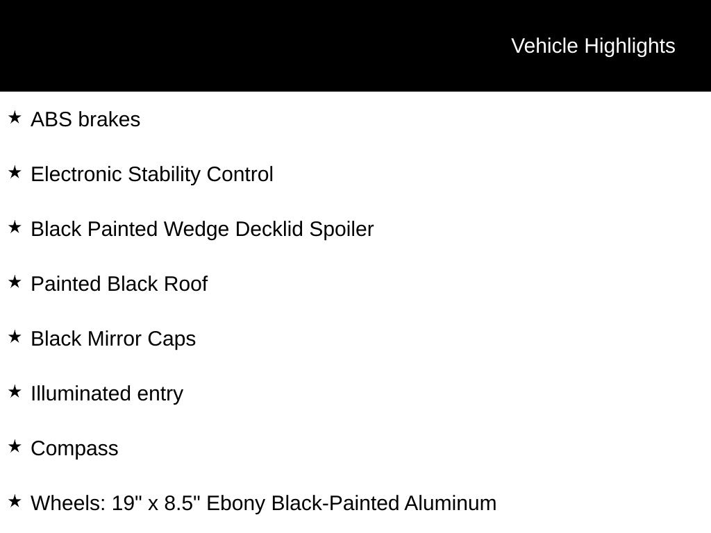 - Wheels: 19" x 8.5" Ebony Black-Painted Aluminum