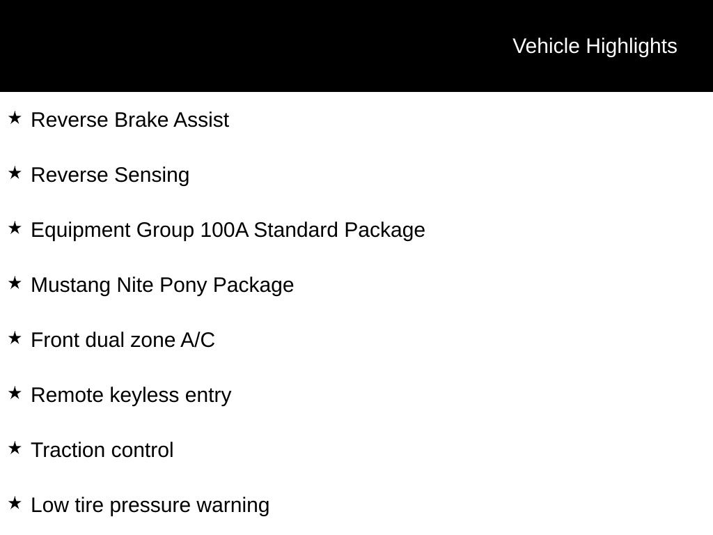2026 Shadow Black 2026 Ford Mustang EcoBoost RWD EcoBoost 2.3L I4 GTDi DOHC Turbocharged VCT 12.4" LCD Digital Driver Cluster, 13.2" LCD Centerstack Touchscreen, Auto LED Headlights, Backup Camera, Parking Sensors, Power Mirror Package, Power Package, Push Button Start, Reverse Brake Assist, Reverse Sensing, 2D Coupe, EcoBoost 2.3L I4 GTDi DOHC Turbocharged VCT, 10-Speed Automatic, RWD, ABS brakes, Alloy wheels, Black Mirror Caps, Black Painted Wedge Decklid Spoiler, Compass, Electronic Stability Control, Equipment Group 100A Standard Package, Front dual zone A/C, Illuminated entry, Low tire pressure warning, Mustang Nite Pony Package, Painted Black Roof, Remote keyless entry, Traction control, Wheels: 19" x 8.5" Ebony Black-Painted Aluminum. Equipment Group 100A Standard Package (AM/FM Stereo, Cloth Bucket Seats, and SYNC 4), Mustang Nite Pony Package (Black Mirror Caps, Black Painted Wedge Decklid Spoiler, Painted Black Roof, and Wheels: 19" x 8.5" Ebony Black-Painted Aluminum), 2D Coupe, EcoBoost 2.3L I4 GTDi DOHC Turbocharged VCT, 10-Speed Automatic, RWD, ABS brakes, Alloy wheels, Compass, Electronic Stability Control, Front dual zone A/C, Illuminated entry, Low tire pressure warning, Remote keyless entry, Traction control, 4-Wheel Disc Brakes, 6 Speakers, Air Conditioning, AM/FM radio, Auto High-beam Headlights, Automatic temperature control, Brake assist, Bumpers: body-color, Delay-off headlights, Driver door bin, Driver vanity mirror, Dual front impact airbags, Dual front side impact airbags, Emergency communication system: 911 Assist, Exterior Parking Camera Rear, Four wheel independent suspension, Front anti-roll bar, Front Bucket Seats, Front Center Armrest, Front reading lights, Fully automatic headlights, Knee airbag, Leather Shift Knob, Occupant sensing airbag, Outside temperature display, Overhead airbag, Overhead console, Panic alarm, Passenger door bin, Passenger vanity mirror, Power door mirrors, Power steering, Power windows, Radio data system, Rain sensing wipers, Rear anti-roll bar, Rear Parking Sensors, Rear window defroster, Speed control, Speed-sensing steering, Speed-Sensitive Wipers, Split folding rear seat, Sport steering wheel, Steering wheel mounted audio controls, Tachometer, Telescoping steering wheel, Tilt steering wheel, Trip computer, and Voltmeter Courtesy Ford and Lincoln of Rome 101 Hwy 411 E Rome, Ga 30161 ROMEFORDLINC.COM 706.235.4453.